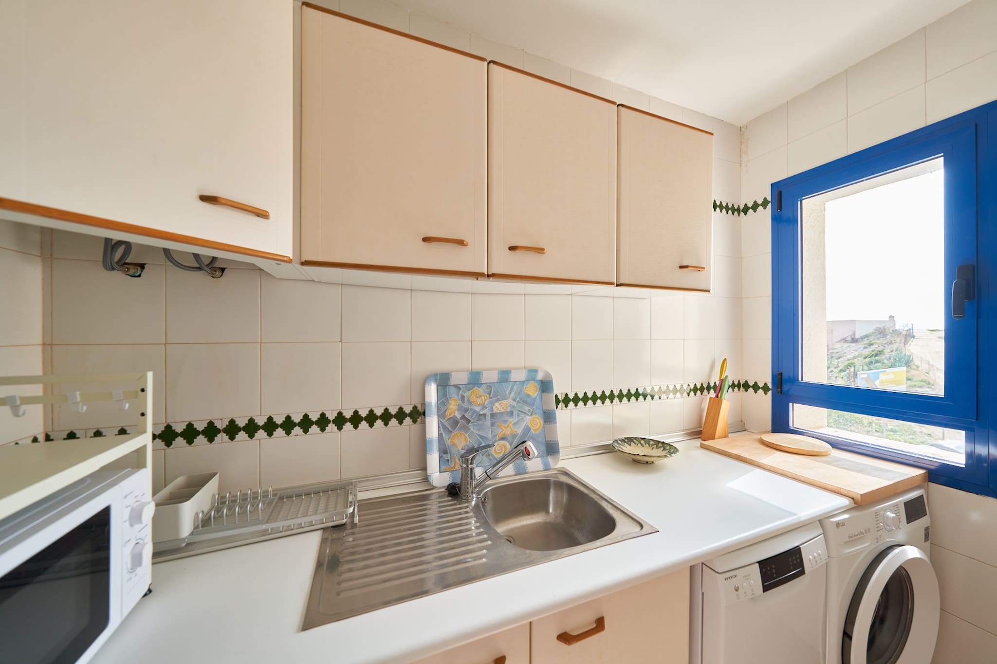 El apartamento en Níjar posee 2 dormitorio(s) y capacidad para 4 personas. Alojamiento de 55 m². Dispone de lavadora, acceso internet (wifi), secador, calefacción bomba de calor, aire acondicionado, Televisión.La cocina americana, de vitrocerámica, está equipada con nevera, microondas, horno, congelador, lavavajillas, vajilla/cubertería, utensilios/cocina, cafetera y tostadora.
