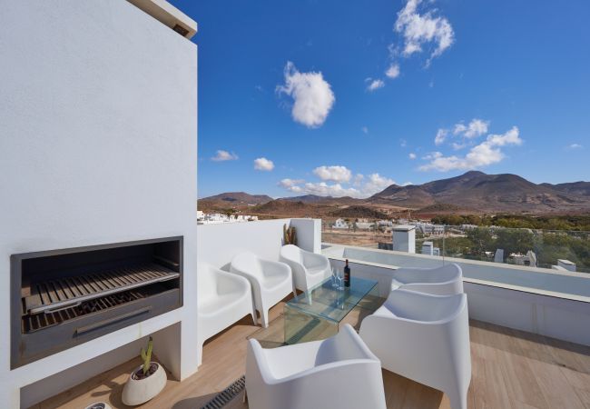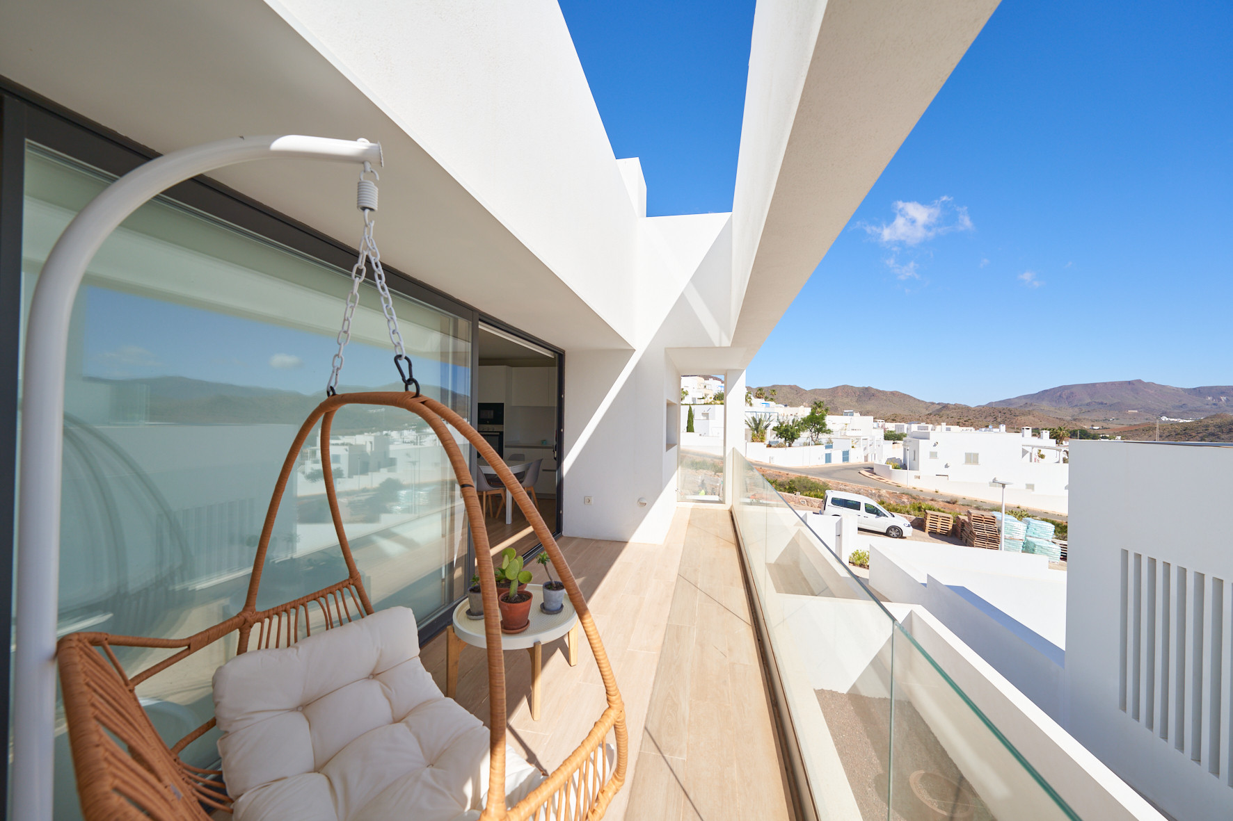 Preciosa casa muy equipada de obra nueva, ubicada en una zona tranquila de San José. Ideal para pasar unas vacaciones en familia. Posee 3 dormitorios, 2 baños y un aseo, plaza de garaje, jardín, terraza y solárium con barbacoa. Urbanización con piscina y zonas comunitarias.