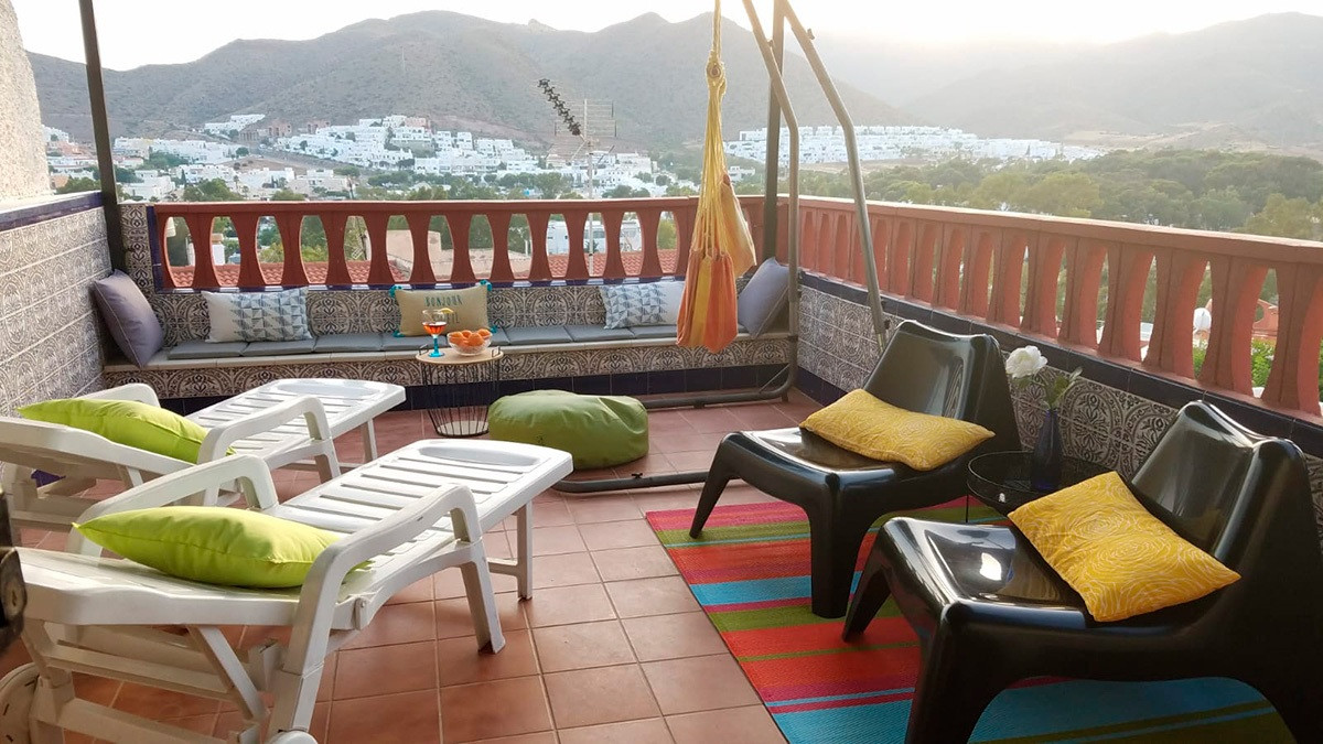 Terraza chill out con vistas al mar y una segunda terraza con comedor, el apartamento dispone de dos dormitorios, un baño con amplia ducha. Casa Casergyo está totalmente equipada para alquiler vacacional, con estancia mínima de 4 noches.