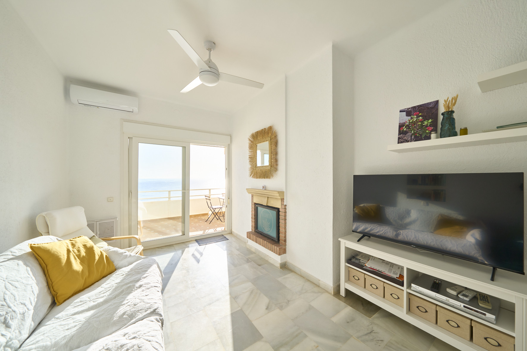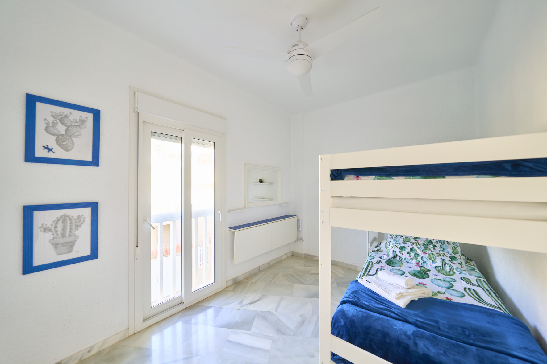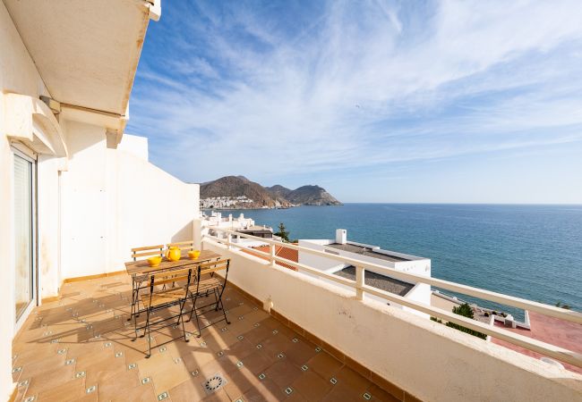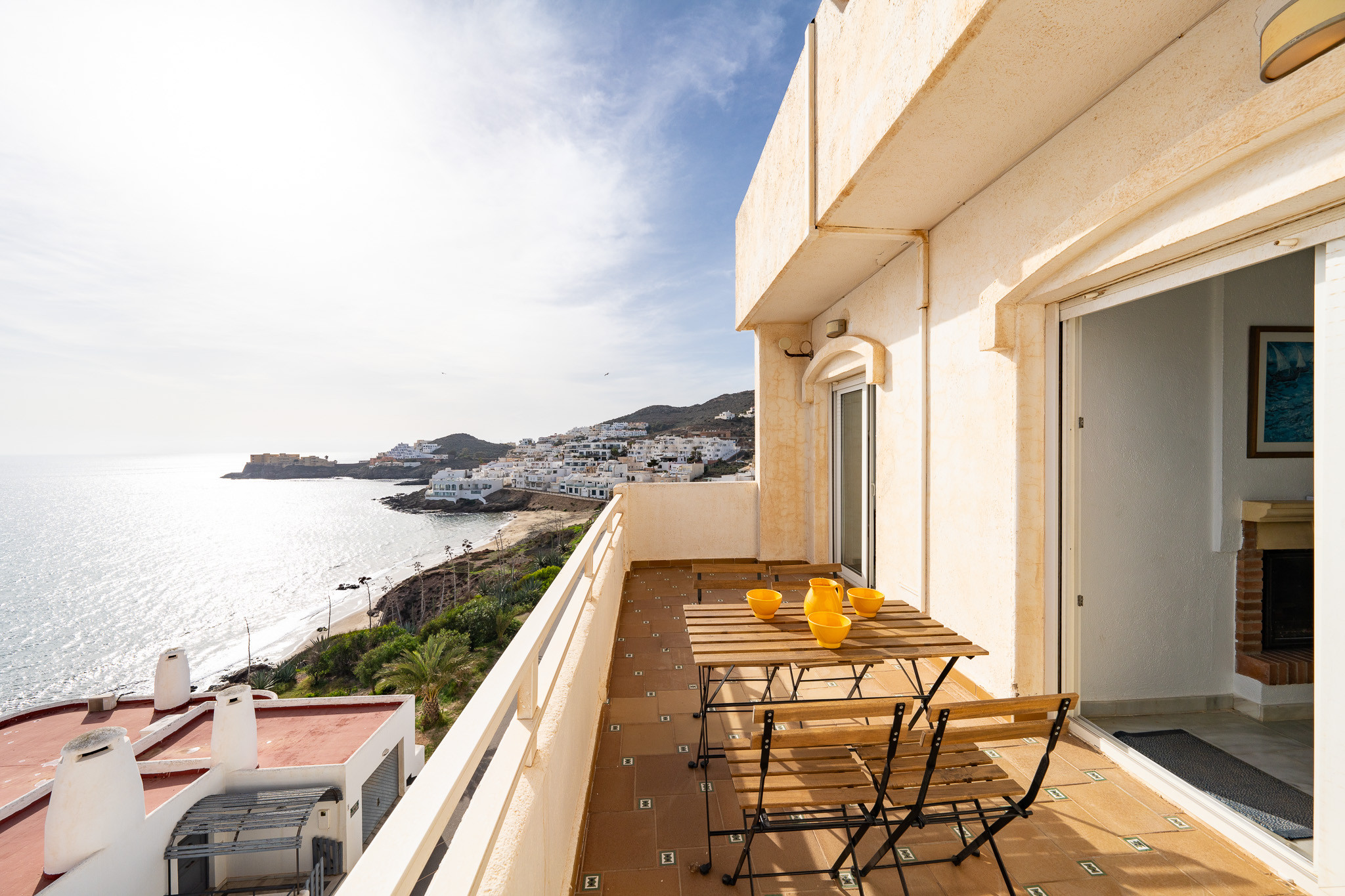 Apartamento en planta ático. Tiene dos dormitorios, uno con cama de 150 y baño en suite y un segundo dormitorio con dos camas de 90 cm y baño con ducha. A/A en todas las estancias.Terraza con unas vistas espectaculares de la Bahía de San José.