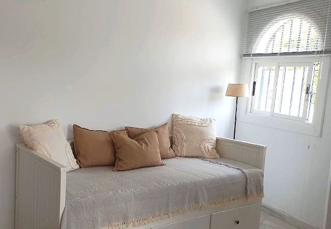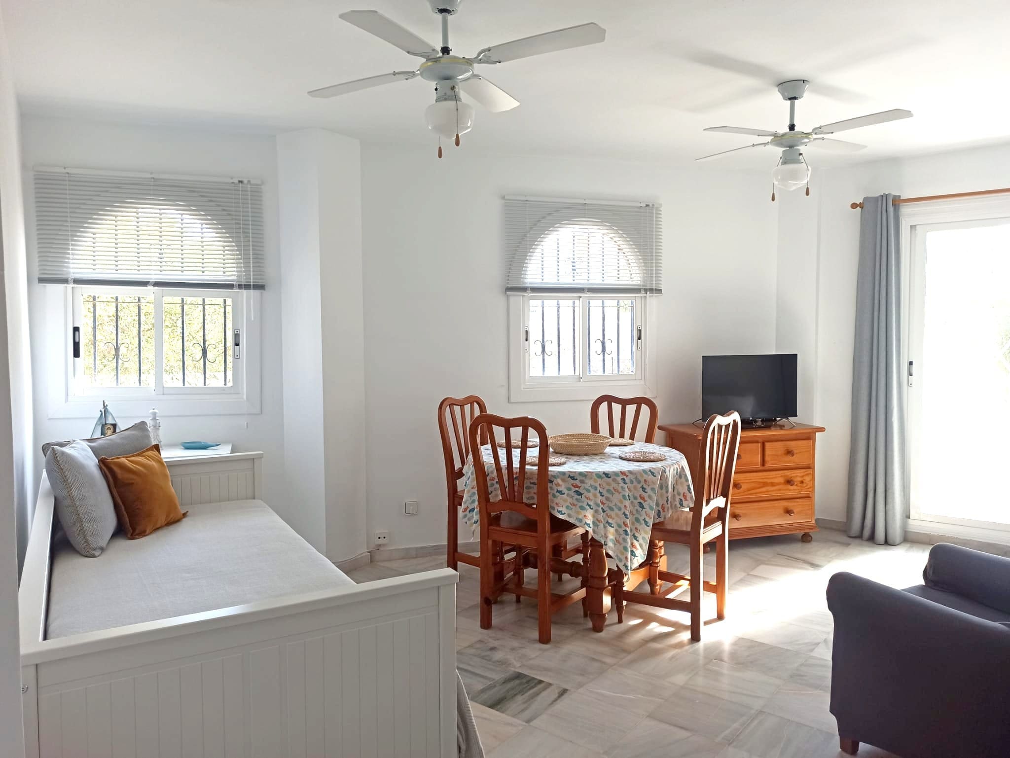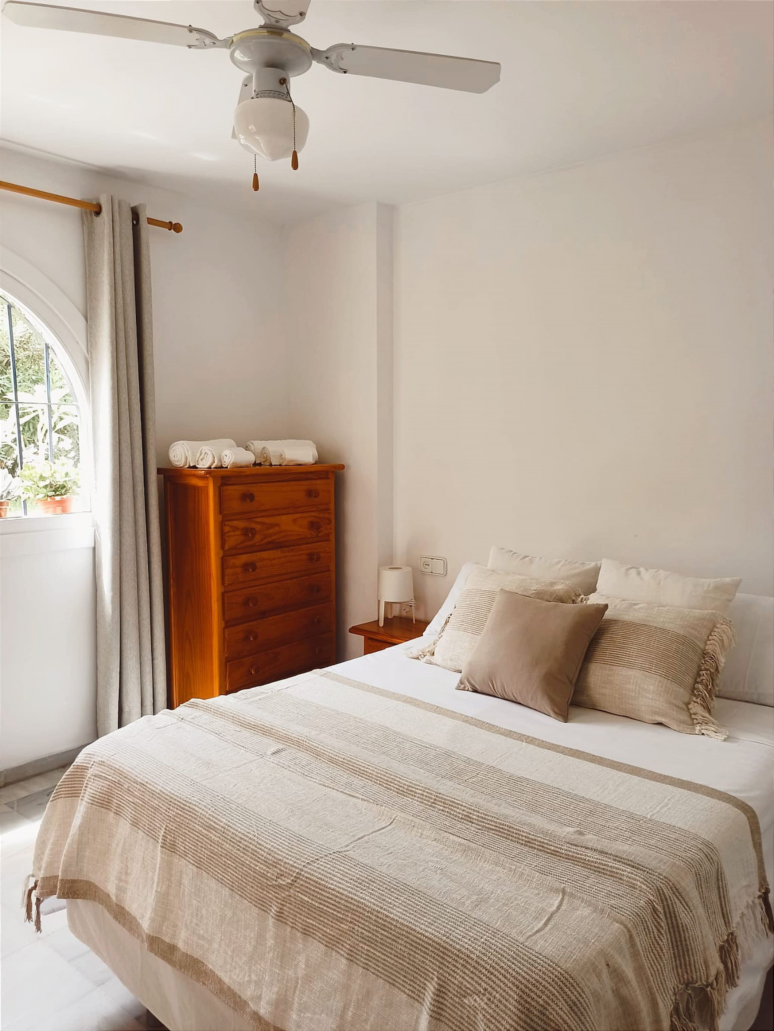 Aire Acondicionado en el salón.El apartamento cuenta con un dormitorio equipado con una cómoda cama de 150 cm, ventilador de techo y televisión (smart TV). Además cuenta con un escritorio plegable junto a la ventana, ideal para desayunar o disfrutar de la lectura.