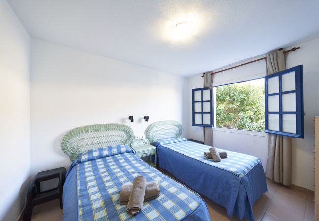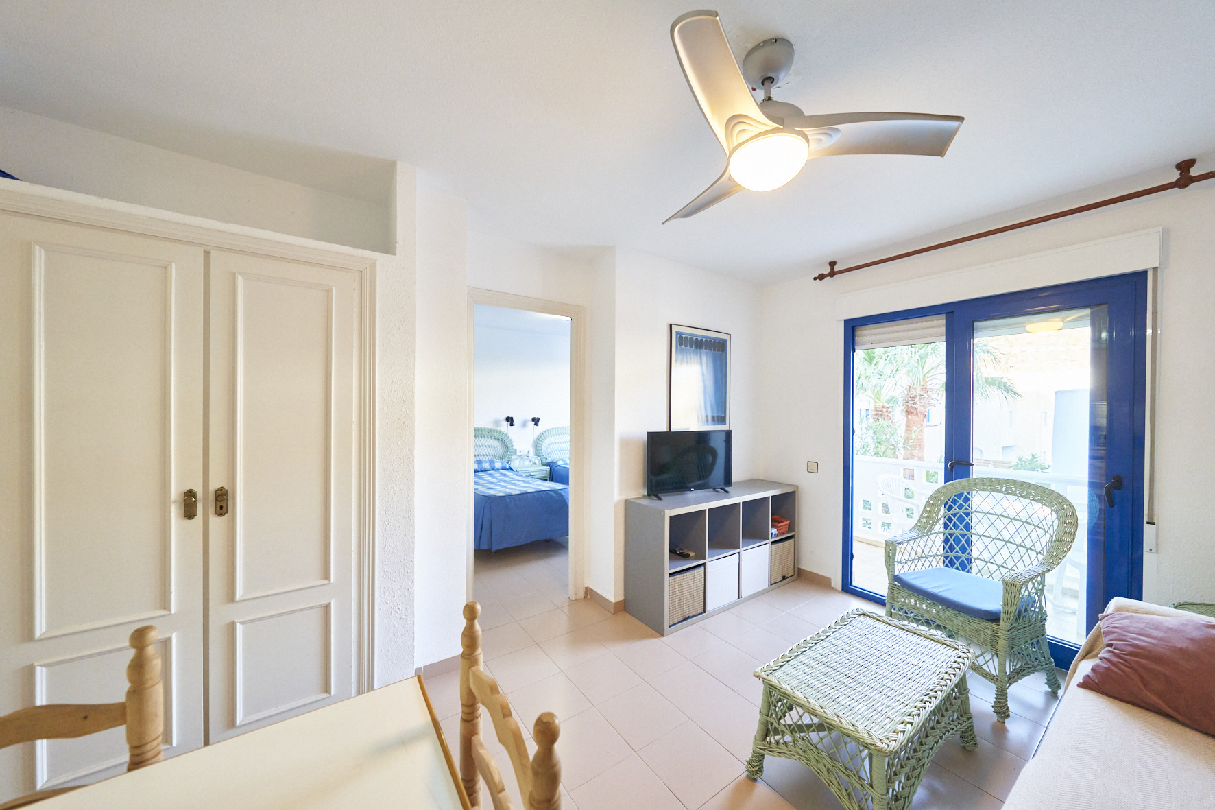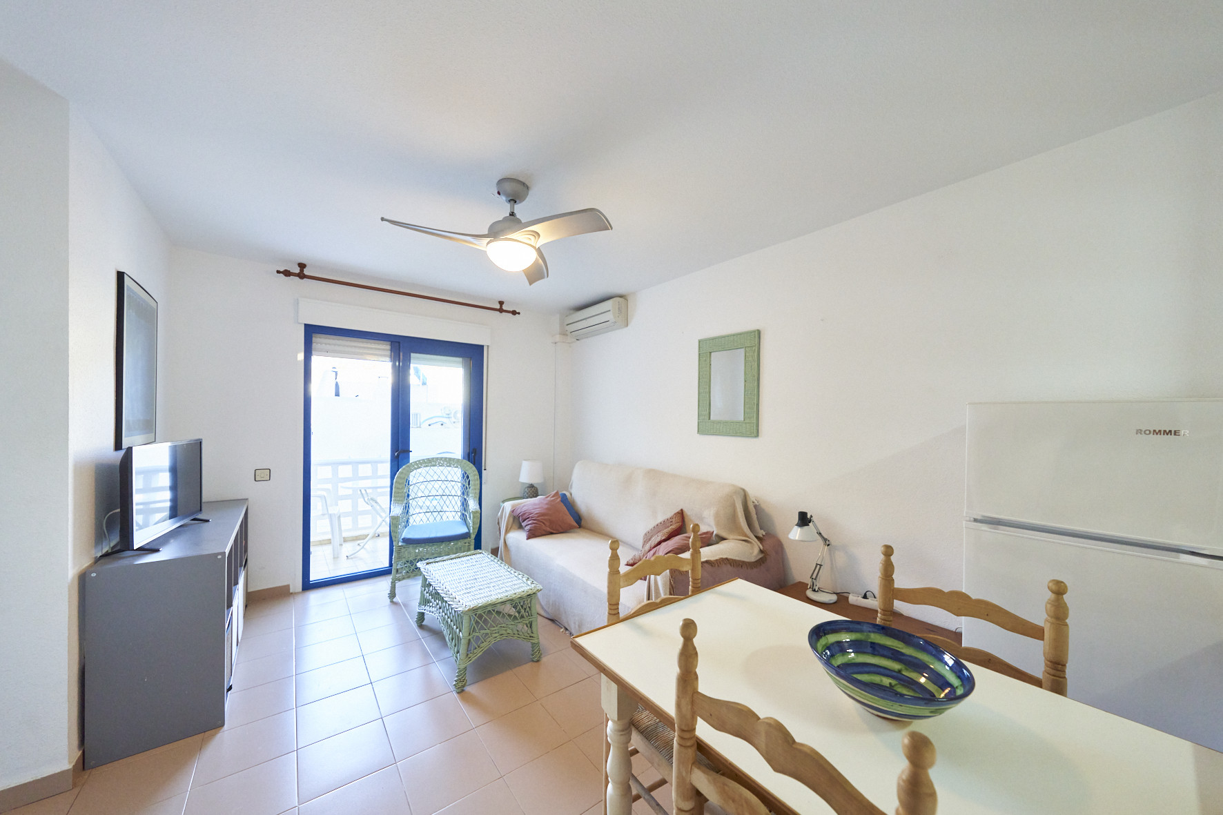 El apartamento en San Jose posee 1 dormitorio(s) y capacidad para 3 personas. Alojamiento de 40 m². Dispone de jardín, mobiliario jardín, terraza, lavadora, plancha, secador, balcón, calefacción bomba de calor, aire acondicionado solo en salón, piscina comunitaria, Televisión.La cocina americana, de vitrocerámica, está equipada con nevera, microondas, congelador, vajilla/cubertería, utensilios/cocina, cafetera y tostadora.
