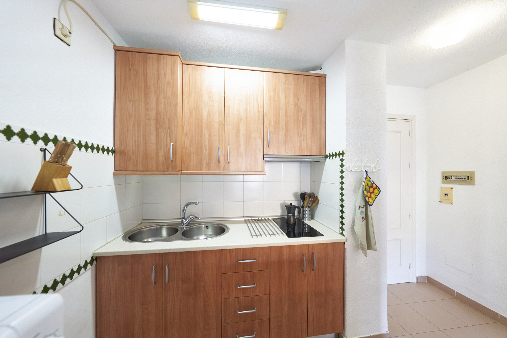 Apartamento de 1 dormitorio, con cama de 135 cm. 1 baño completo con bañera. Cocina completa de menaje, frigorífico, lavadora, horno, microondas, tostador, cafetera, batidora, plancha de ropa y tabla de planchar.