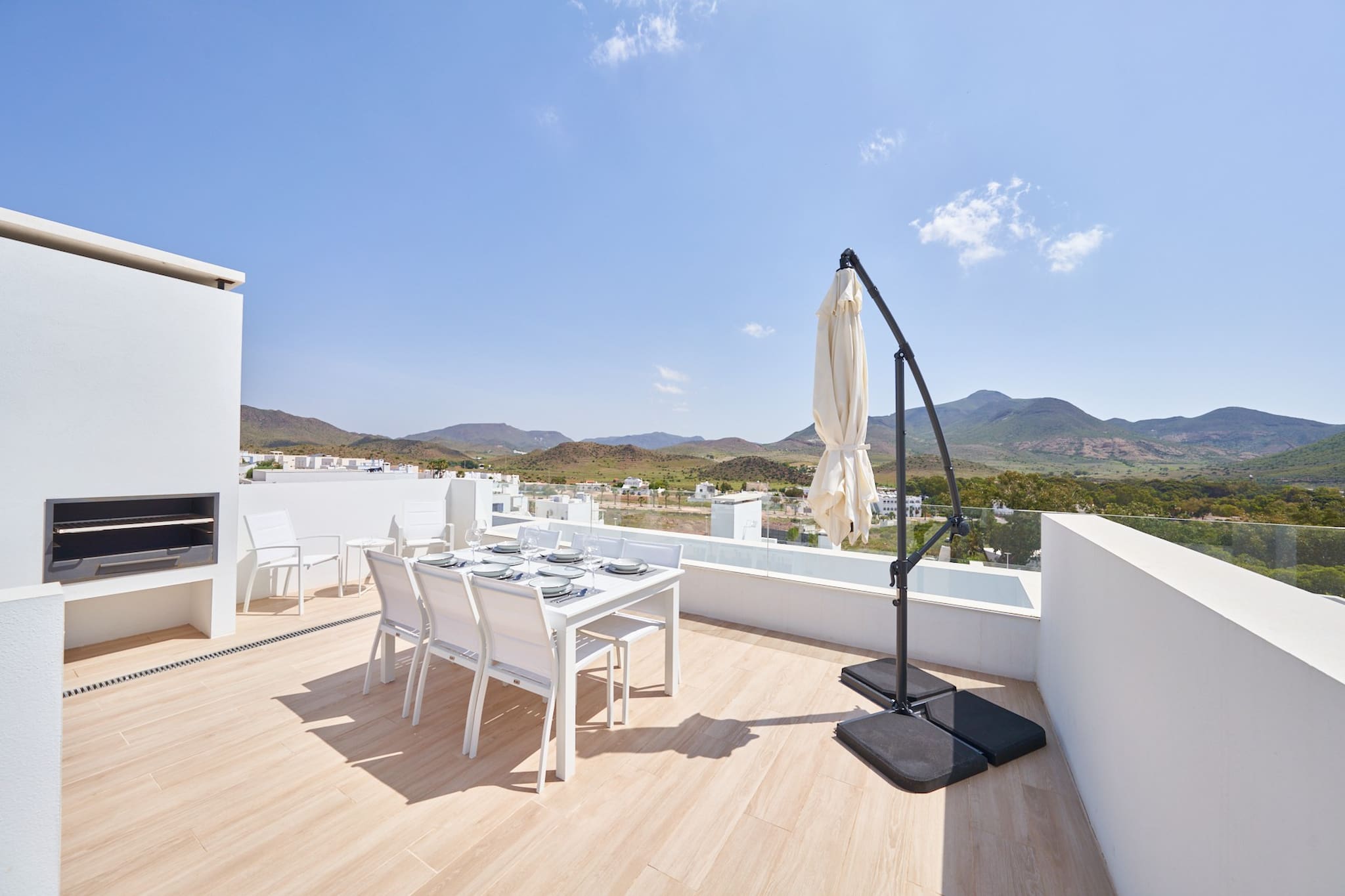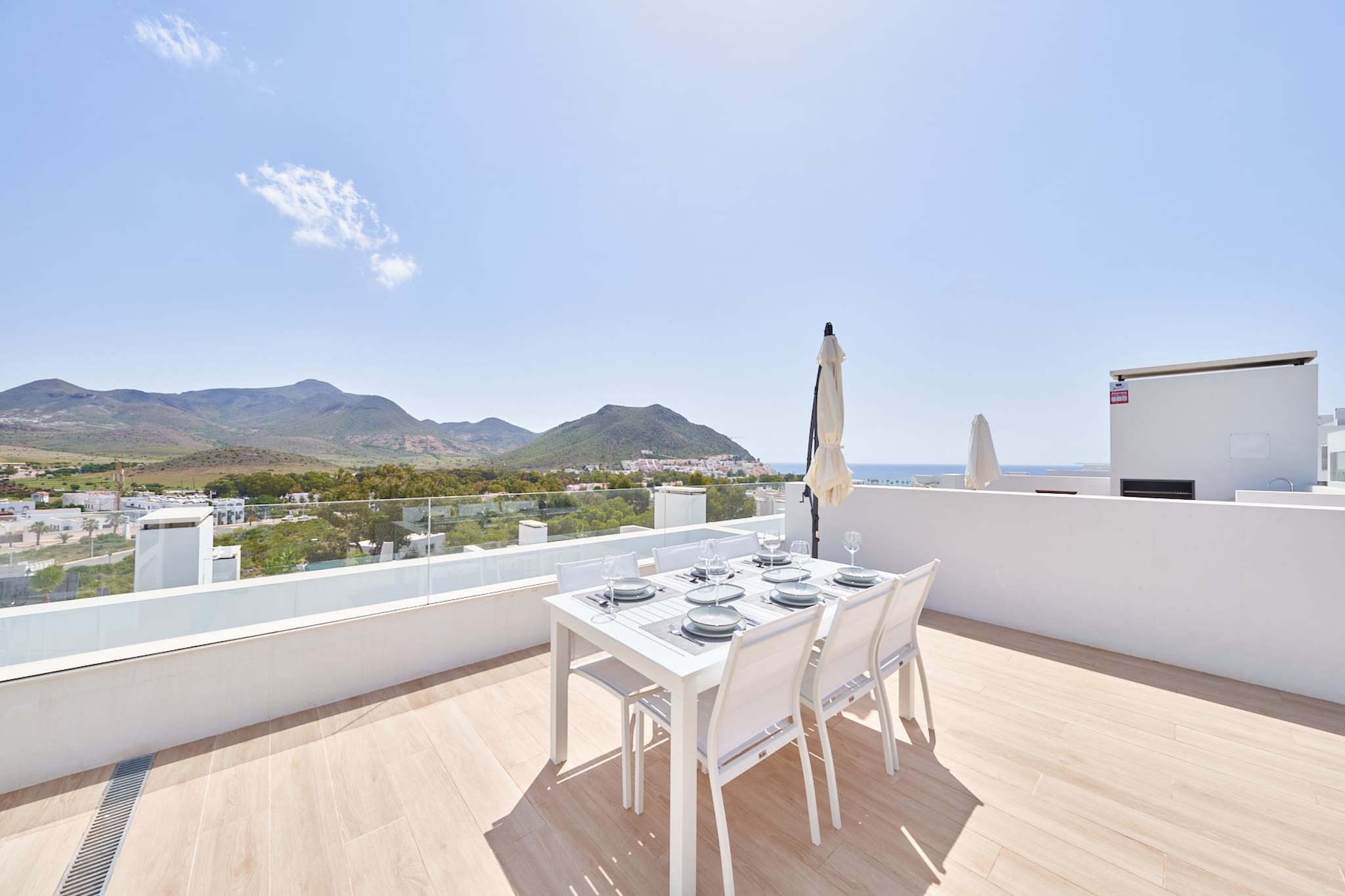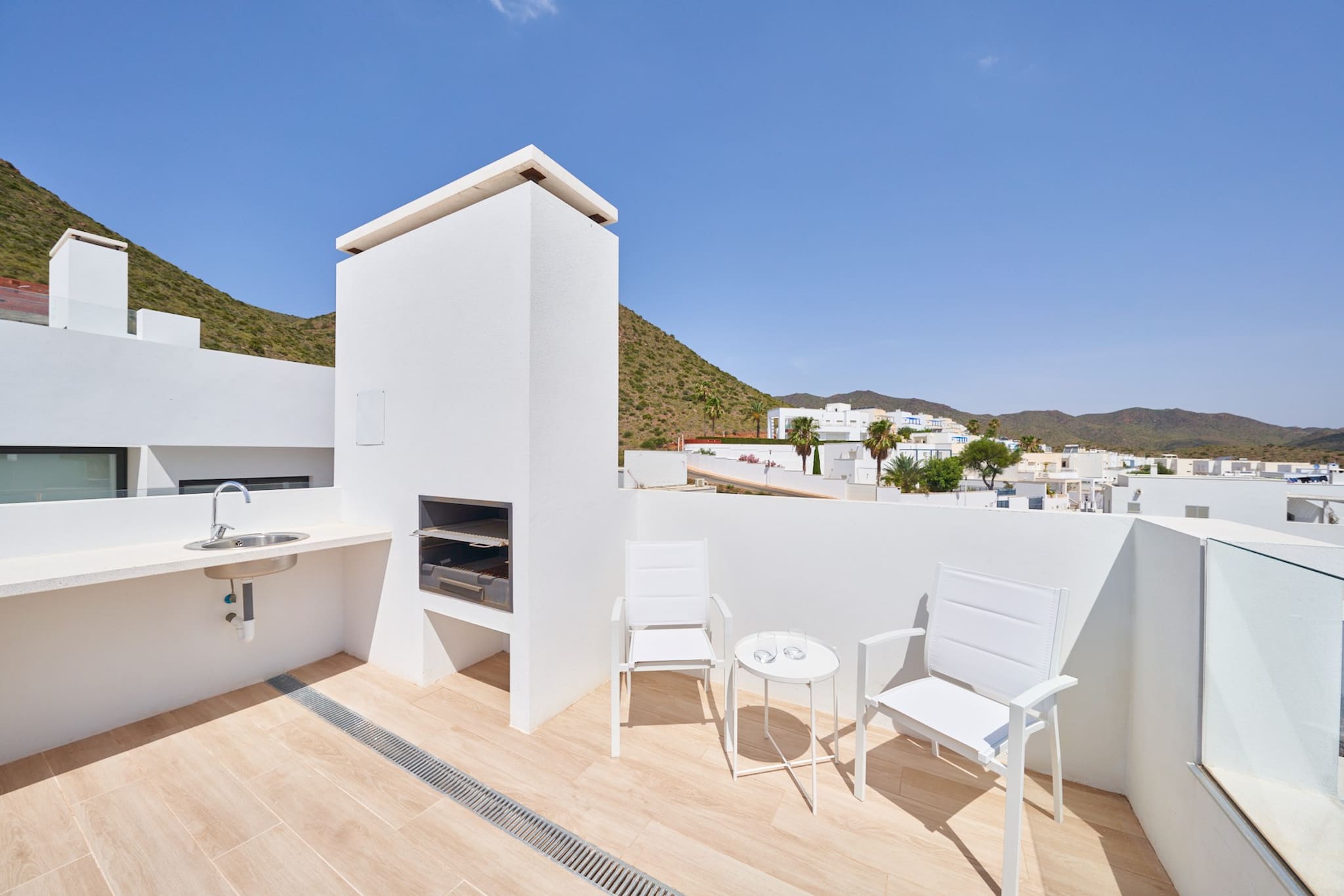 Maison à Níjar qui possède 3 chambre(s) et Capacité pour 6 personnes. Logement de 130 m². Elle dispose de jardin, mobilier de jardin, clôture, 15 m² de terrasse, lave-linge, barbecue, cheminée, fer à repasser, accès internet (wifi), sèche-cheveux, chauffage pompe à chaleur, climatisation dans tout le logement, piscine collective, parking couvert même bâtiment, 1 Télévision.La cuisine indépendante, à vitrocéramique, est équipée avec réfrigérateur, micro-ondes, four, lave-vaisselle, vaisselle/couverts, ustensiles/cuisine, cafetière et bouilloire.