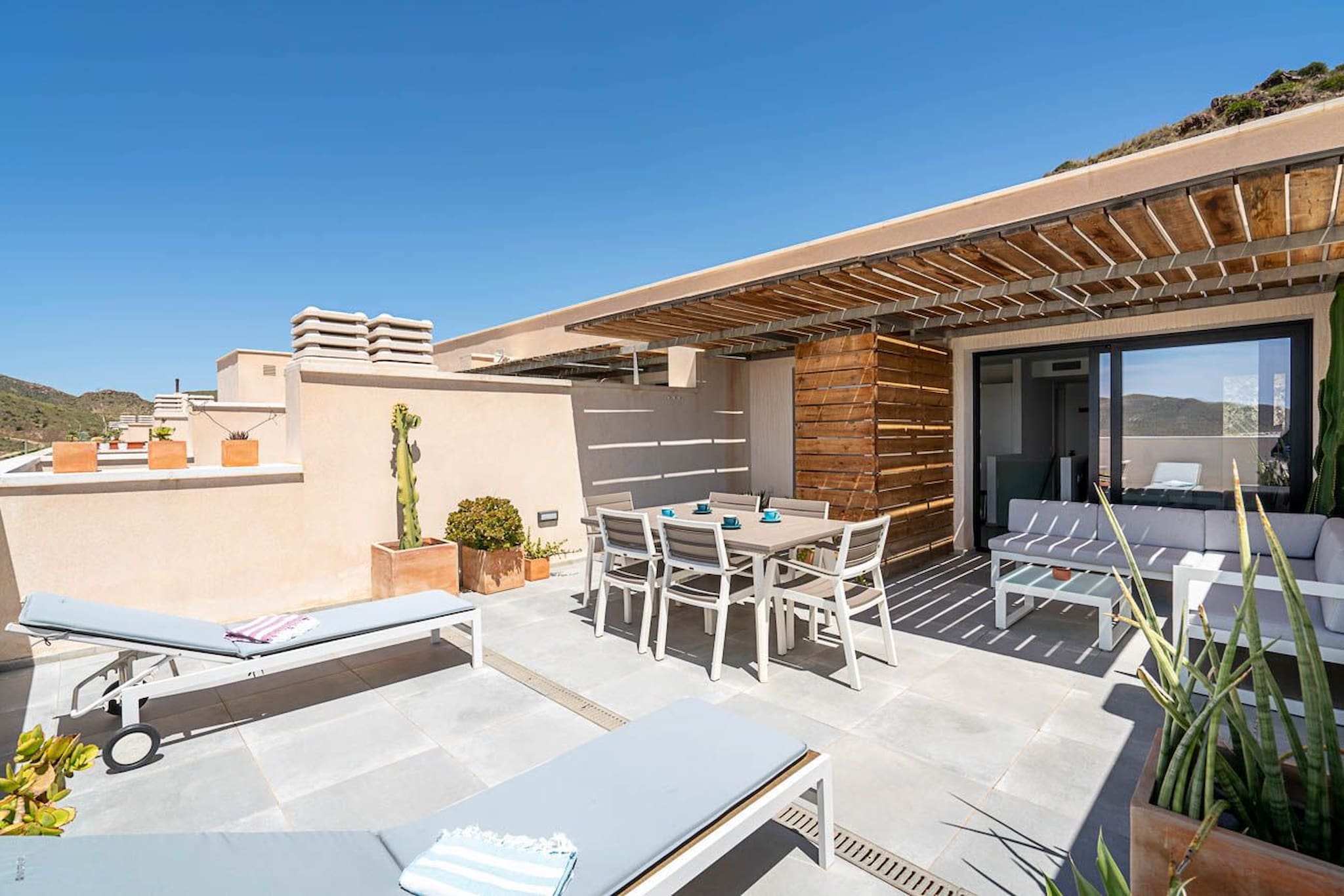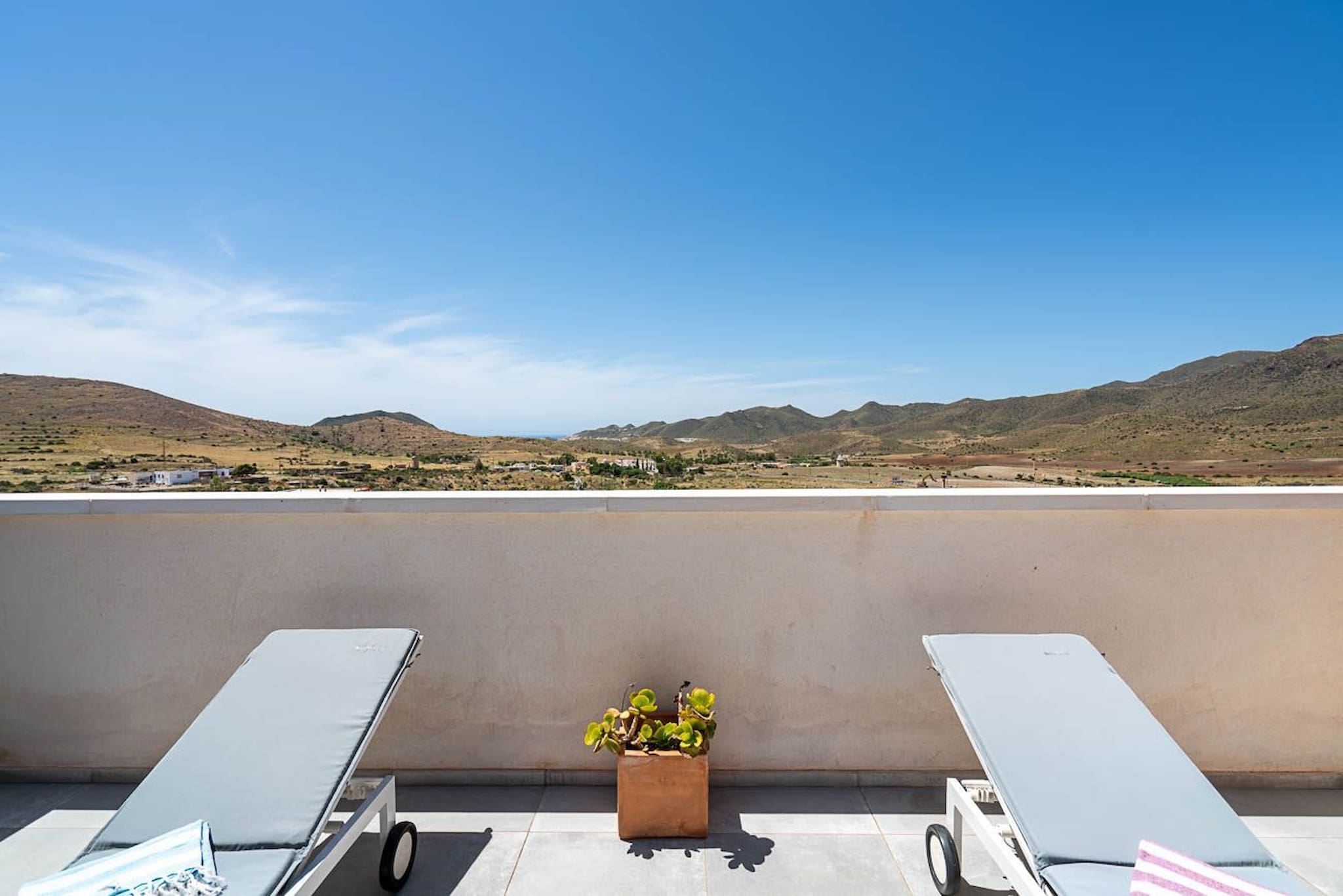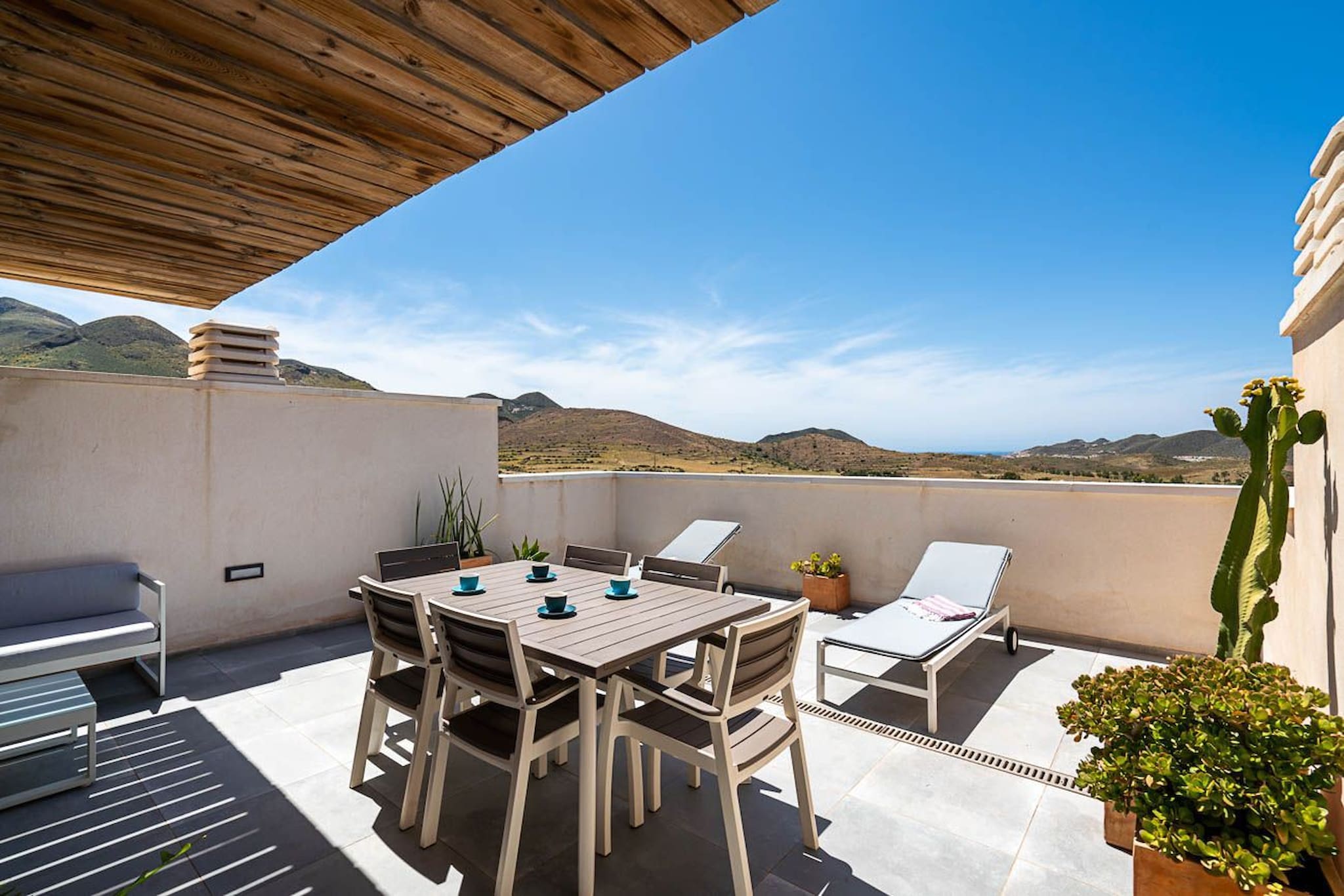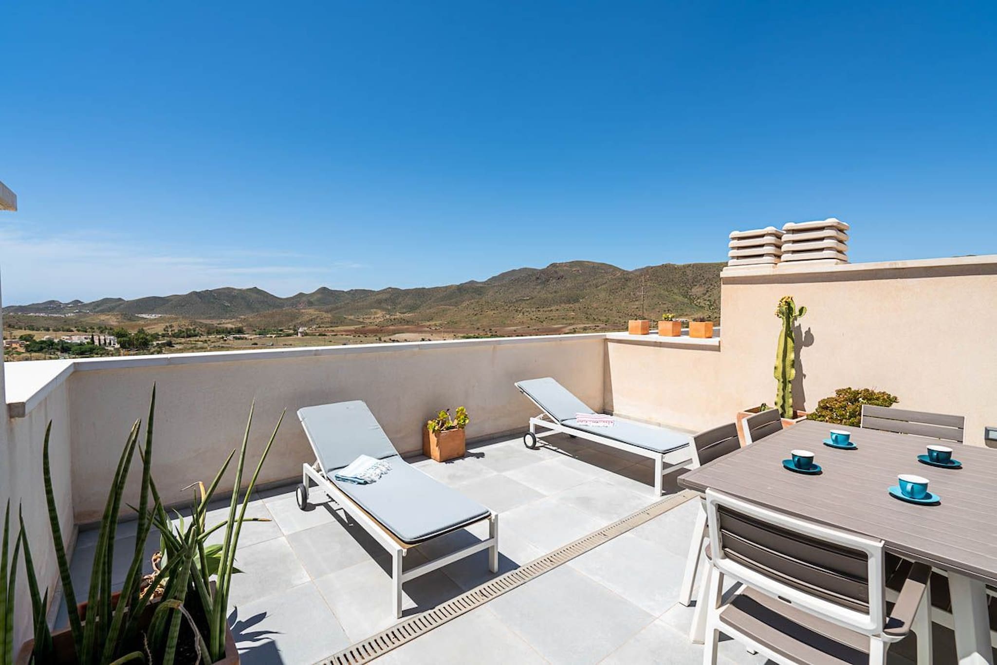 The apartment in Níjar has 2 bedrooms and has capacity for 4 people. The apartment is 110 m². The accommodation is equipped with the following items: garden furniture, 15 m² terrace, washing machine, iron, internet (Wi-Fi), hair dryer, heat pump, air conditioning throughout the house, communal swimming pool, covered parking the same building, 1 fan, 1 TV. In the hotplate of glass ceramics open plan kitchen, refrigerator, microwave, oven, freezer, dishwasher, dishes/cutlery, kitchen utensils, coffee machine, toaster and kettle are provided.