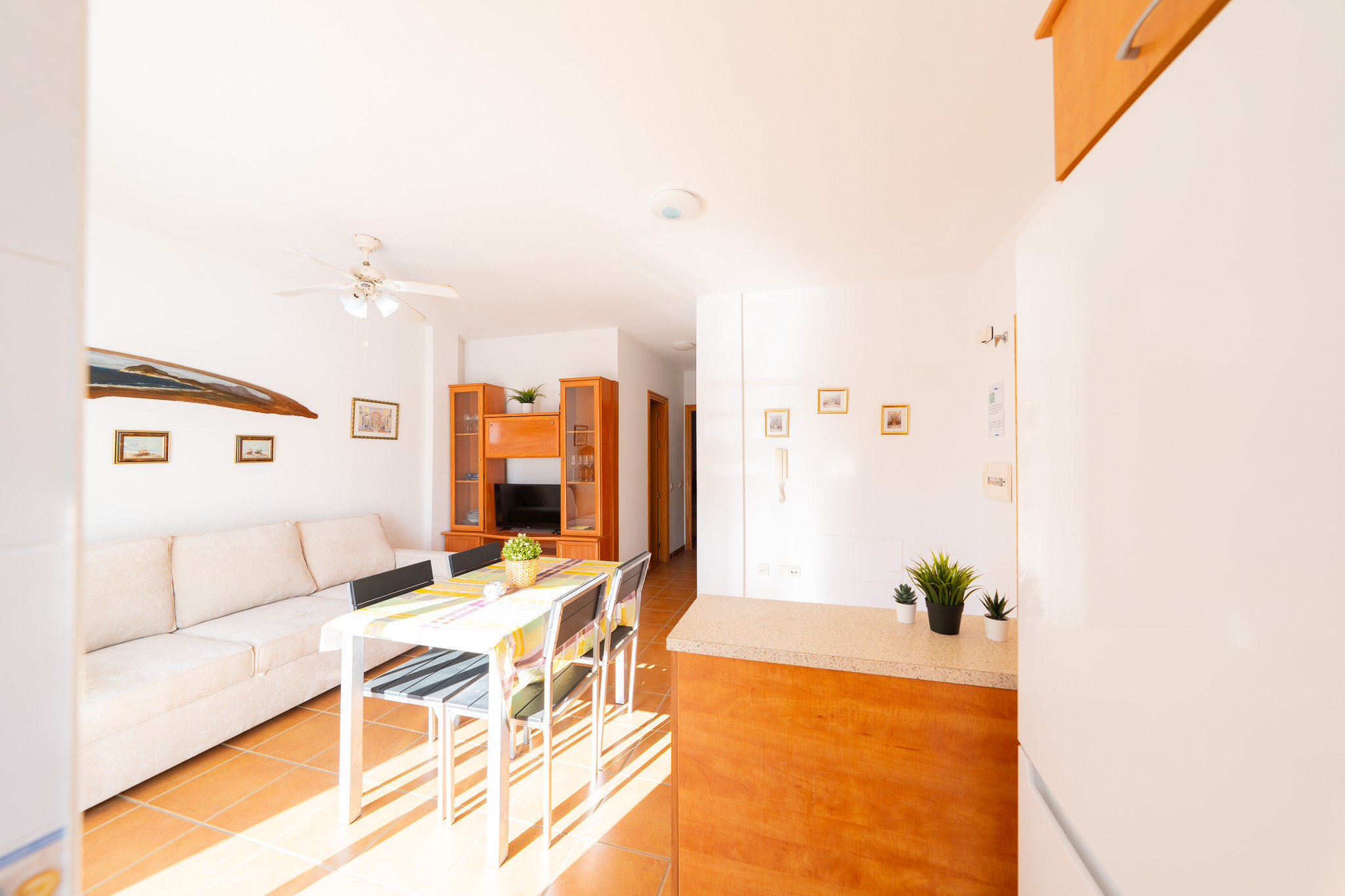 The apartment in San Jose has 2 bedrooms and has capacity for 5 people. The apartment is 45 m². The accommodation is equipped with the following items: 8 m² terrace, washing machine, hair dryer, balcony, garage the same building, 3 fans, 1 TV. In the hotplate of glass ceramics open plan kitchen, refrigerator, microwave, oven, freezer, dishes/cutlery, kitchen utensils, coffee machine, toaster, kettle and juicer are provided.